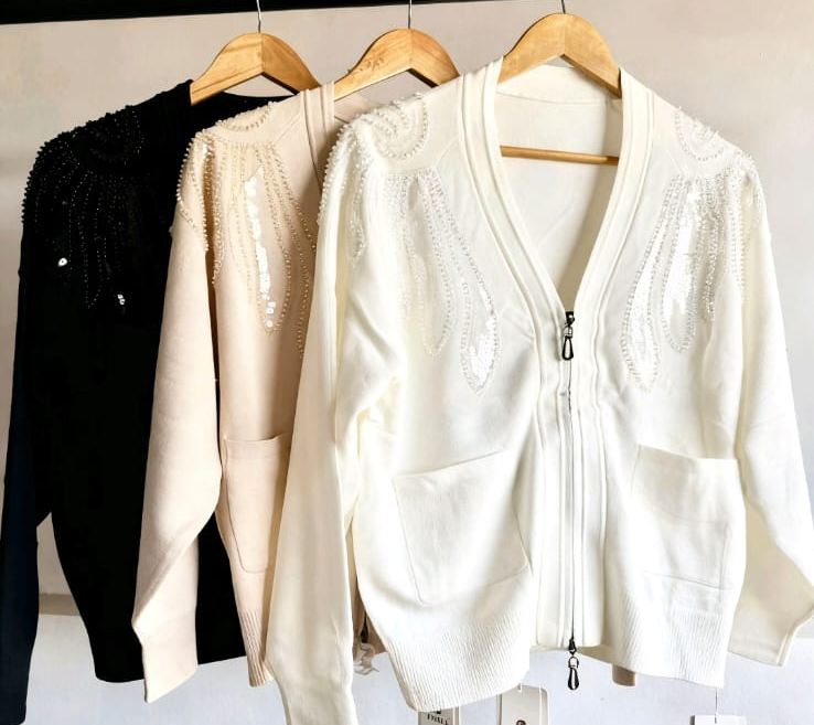 Nuevo Cardigan Con brillos 🌟Tejido Suavecito(Hilo) 🌟Brillos y canutillos QUE BRILLAN💥 🌟3 colores lindos Disponibles 🌟Con bolsillos y cierres metálicos EL TOQUE GLAM QUE TU OUTFIT NECESITA